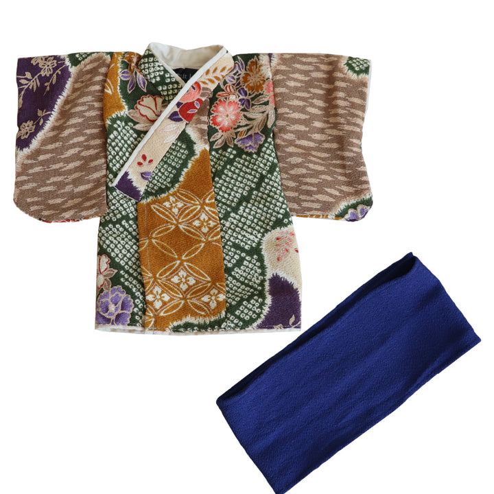 This refined kimono set features traditional Japanese patterns in calming shades of green, gold, and brown. The two-piece set includes a kimono and an obi (belt), both designed with attention to detail and easy to put on or take off.