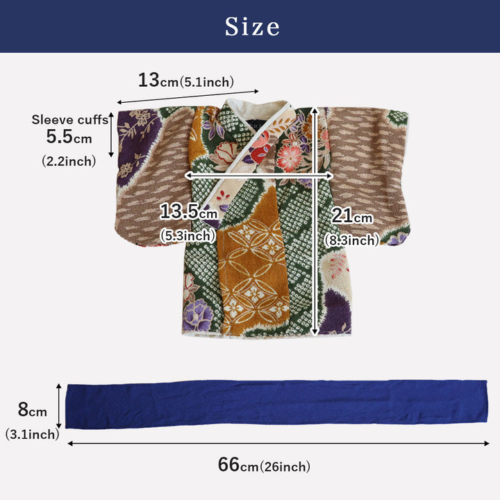 Kimono: Length 21 cm(8.3inch), width 13.5 cm(5.3inch), sleeve cuffs 5.5 cm(2.2inch)