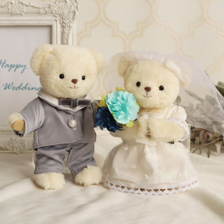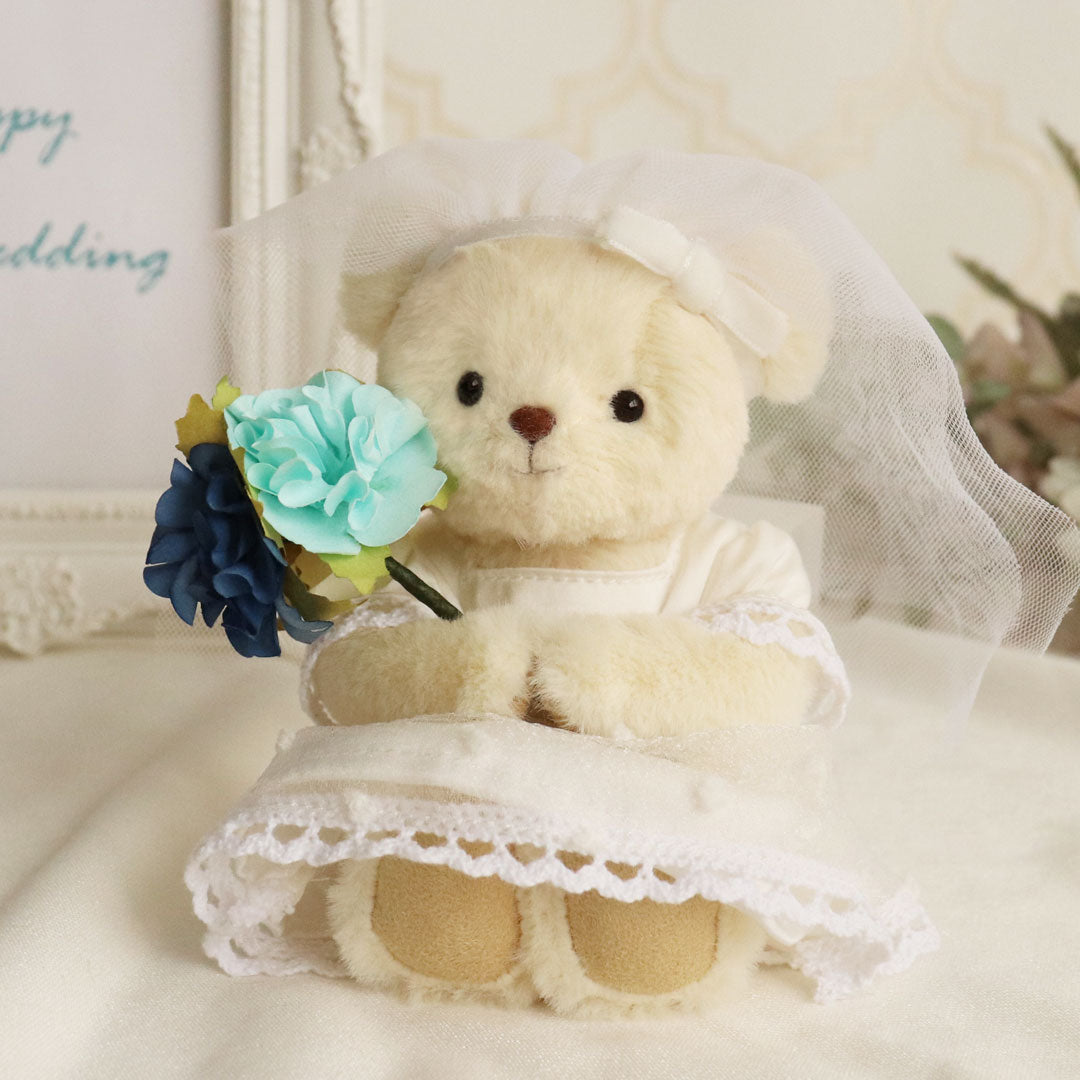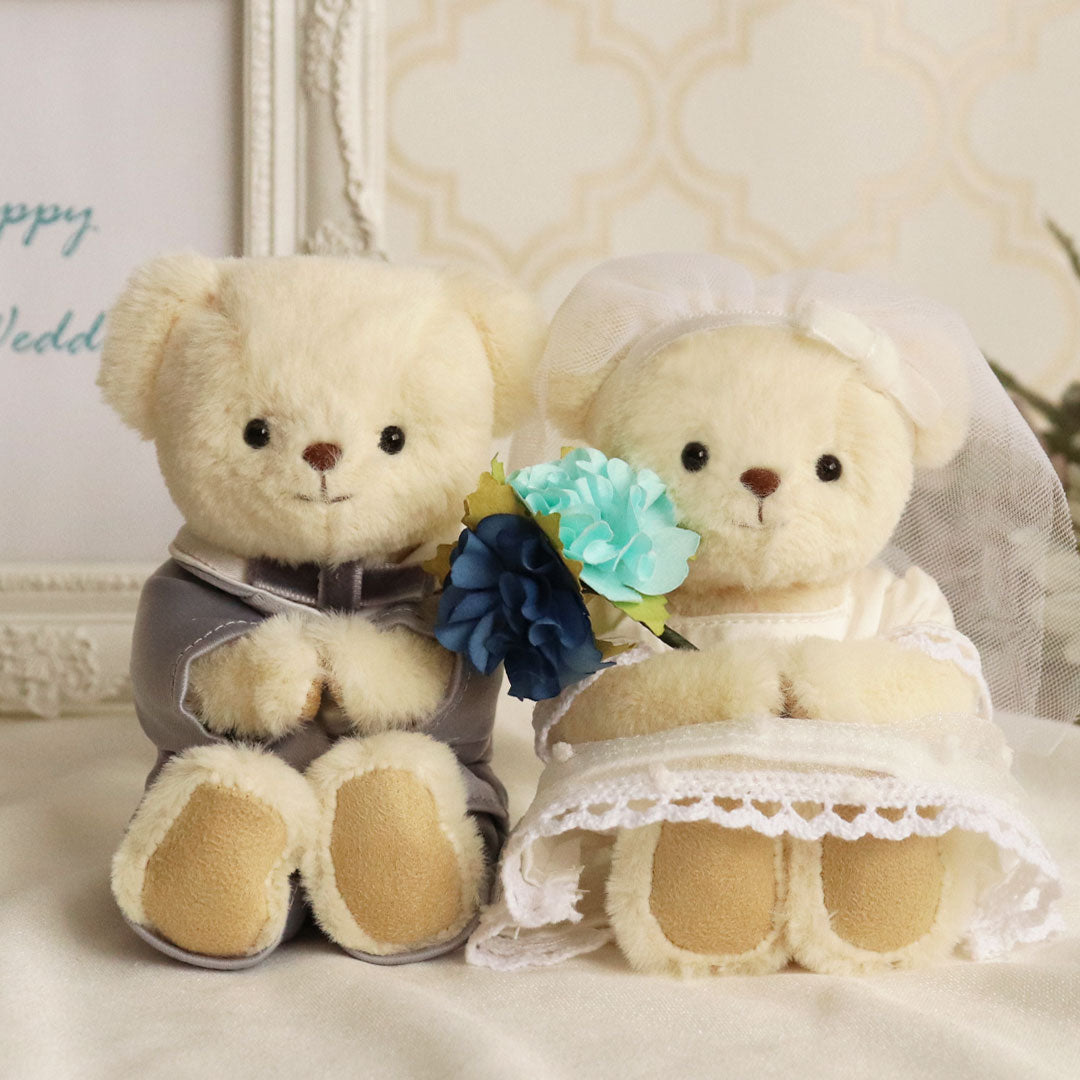Los felices ositos de peluche de bodas es la forma reflexiva y única de expresar sus mejores deseos a una pareja especial en su gran día. Cuenta con imanes en ambas manos, lo que le permite sostener un mini ramo o juntar las manos con otro oso. El oso de esta novia sosteniendo un mini ramo en azul, trayendo un hechizo "algo azul" para la felicidad. Su lindo diseño sirve como una mascota encantadora en la recepción, o como un regalo de felicitación memorable.