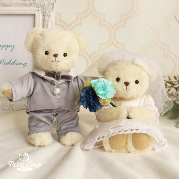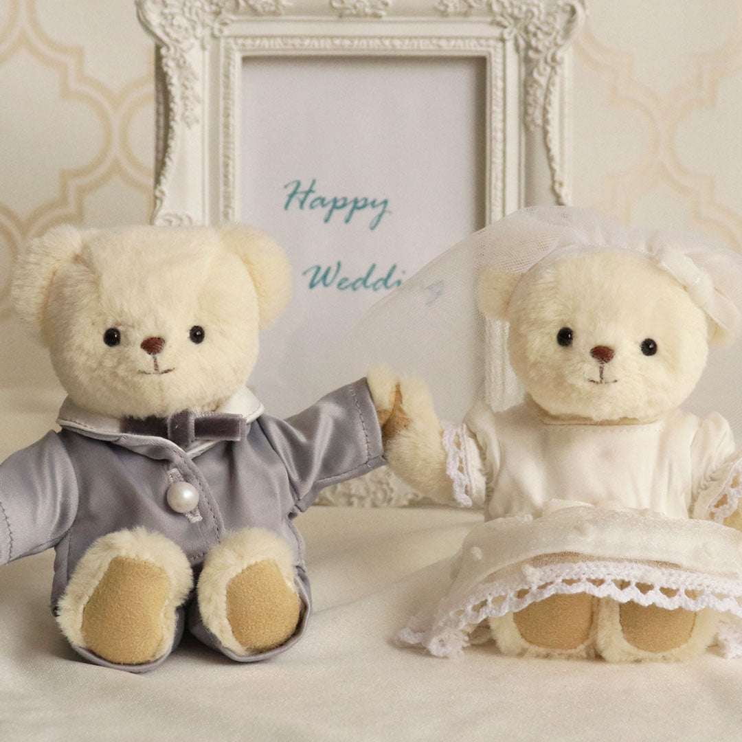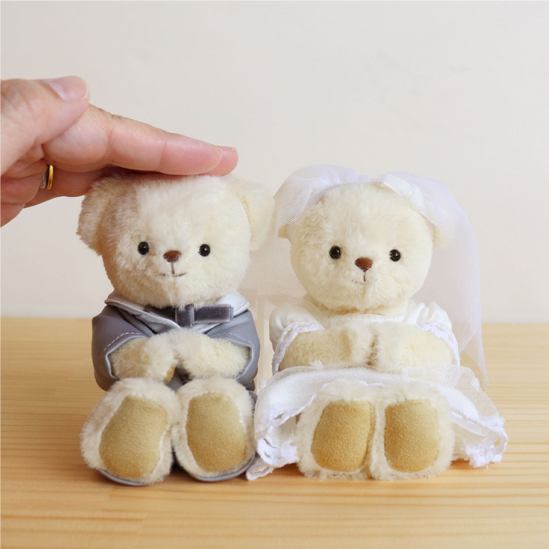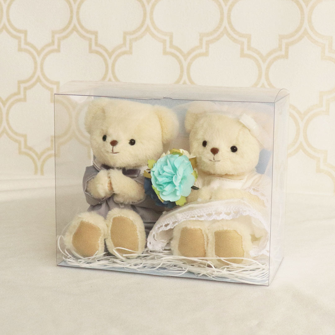 Los felices ositos de peluche de bodas es la forma reflexiva y única de expresar sus mejores deseos a una pareja especial en su gran día. Cuenta con imanes en ambas manos, lo que le permite sostener un mini ramo o juntar las manos con otro oso. El oso de esta novia sosteniendo un mini ramo en azul, trayendo un hechizo "algo azul" para la felicidad. Su lindo diseño sirve como una mascota encantadora en la recepción, o como un regalo de felicitación memorable.