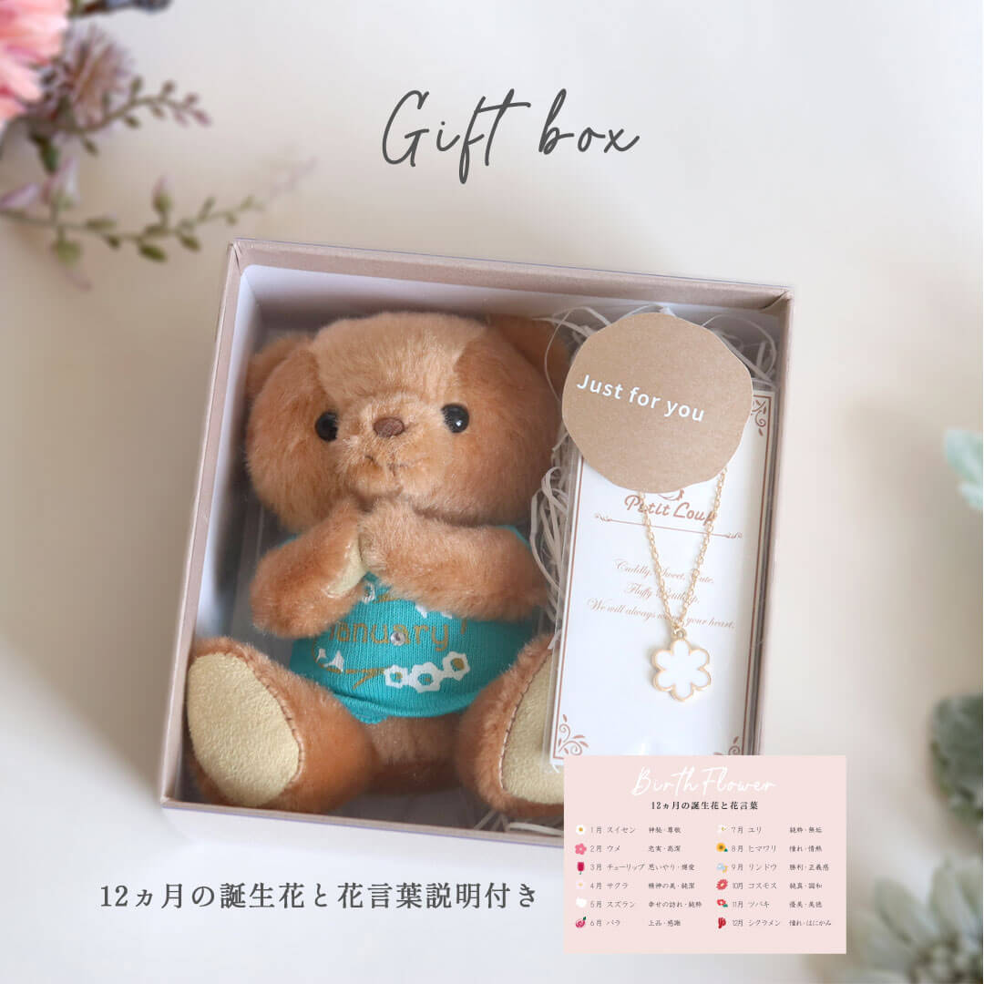 Adorable ours en peluche avec fourrure brune naturelle, portant un t-shirt de fleurs de naissance coordonné et un ensemble cadeau de collier. Les mains de l'ours en peluche sont magnétisées, ce qui lui permet de contenir une carte de message, etc. Profitez de ce collier peu importe votre âge - il est réglable pour les enfants et les adultes. Répartissez la joie et la bonne chance avec cet ours personnalisé et accessoire chic!