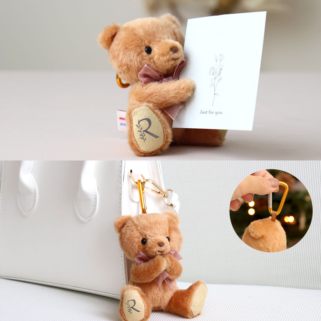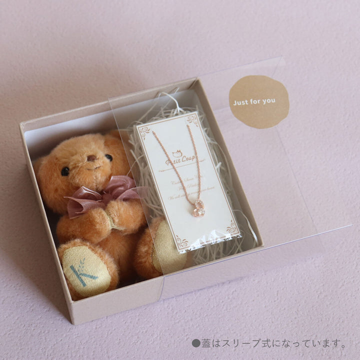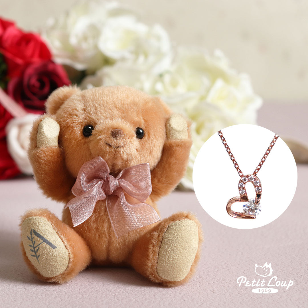 Perfect gift set featuring a customizable teddy bear and a pink gold heart necklace with a crystal accent. The teddy bear comes with a carabiner hook for easy attachment and can be personalized with an initial of your choice, from A to Z, on its sole. With the magnets in its hands, the bear can hold small items or strike various poses. Both items come beautifully packaged in a gift box, making it an ideal present for any occasion.
