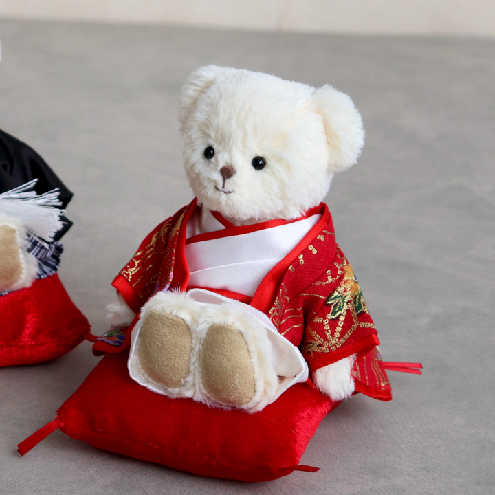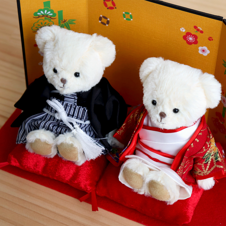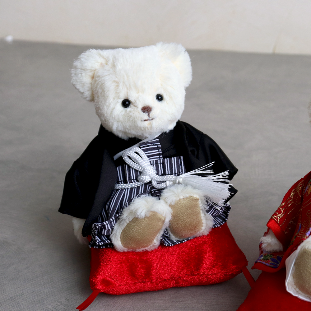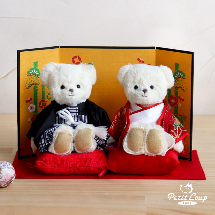 這款優雅的泰迪熊在金色折疊屏幕前微笑著,穿著傳統的日本婚禮服裝:正式的黑色Haori和Hakama的新郎,以及新娘,穿著五顏六色的Iro-uchikake和服。每個元素都經過精心製作,直到錯綜複雜的縫線和現實設計,回應了真正的衣服的外觀。